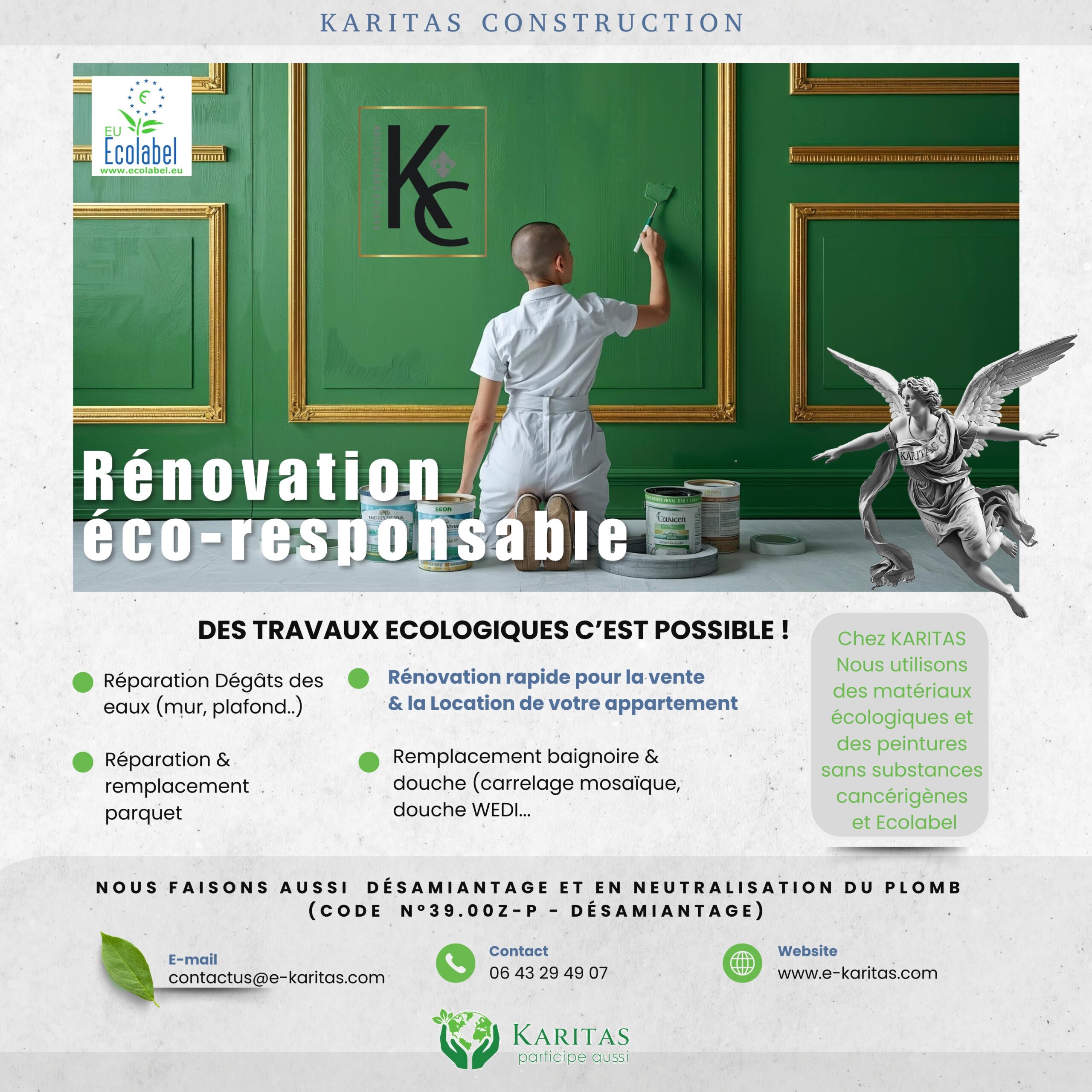 Spécialiste en désamiantage et dépollution plomb , nous sommes certifiés pour intervenir en toute sécurité. Après la dépollution amiante et plomb, nous réalisons des rénovations saines, avec des matériaux écologiques et des peintures sans substances cancérigènes, pour préserver votre santé et celle de la planète. Karitas s'efforce d'utiliser que de la peinture qui bénéficie du label européen Ecolabel qui garantit les performances à l’usage des produits et une réduction de leurs impacts environnementaux tout au long de leur cycle de vie.