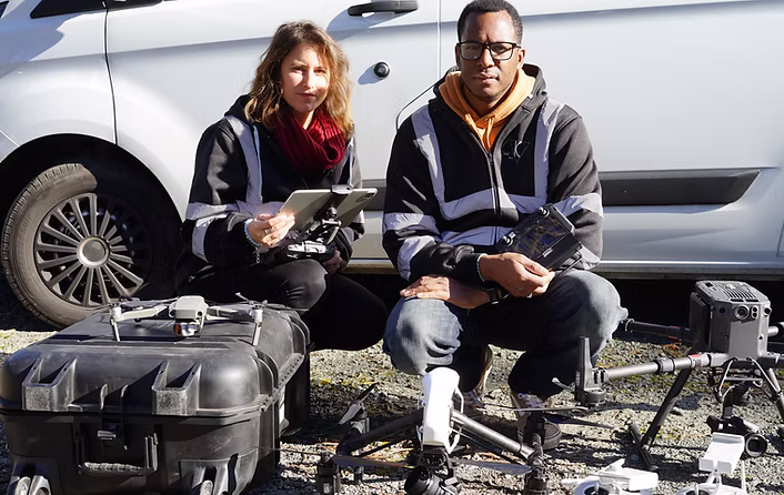 Nous sommes également des télépilotes de drones professionnels enregistrés à la DGAC et Vidéastes, ce qui nous permet de fournir des services de suivi de chantier, d'inspection, topographie/photogrammétrie et audiovisuel par drone pour un travail précis et efficace.
